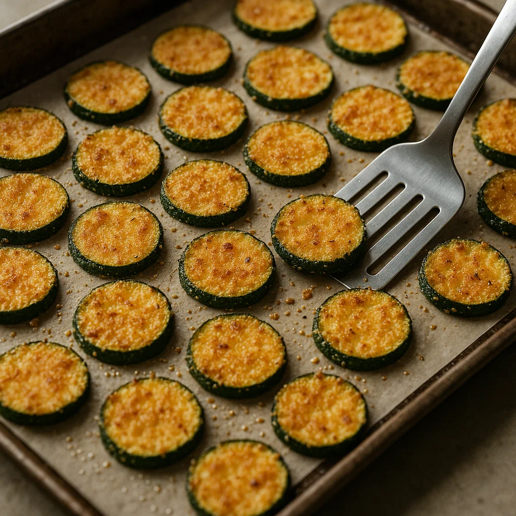 - Once the zucchini chips are crispy and golden, remove them from the oven and let them cool slightly on the baking sheet.