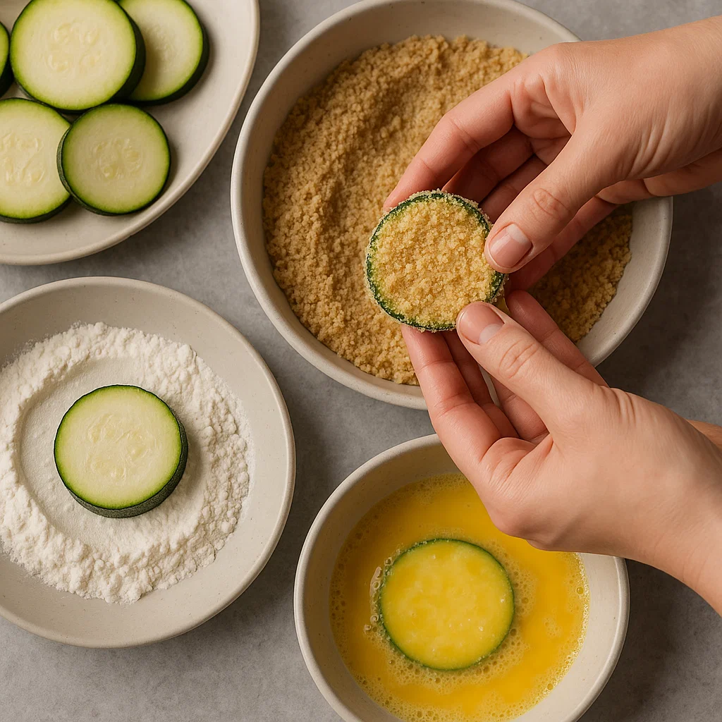 - Dip each zucchini slice into the flour, ensuring it’s coated evenly.