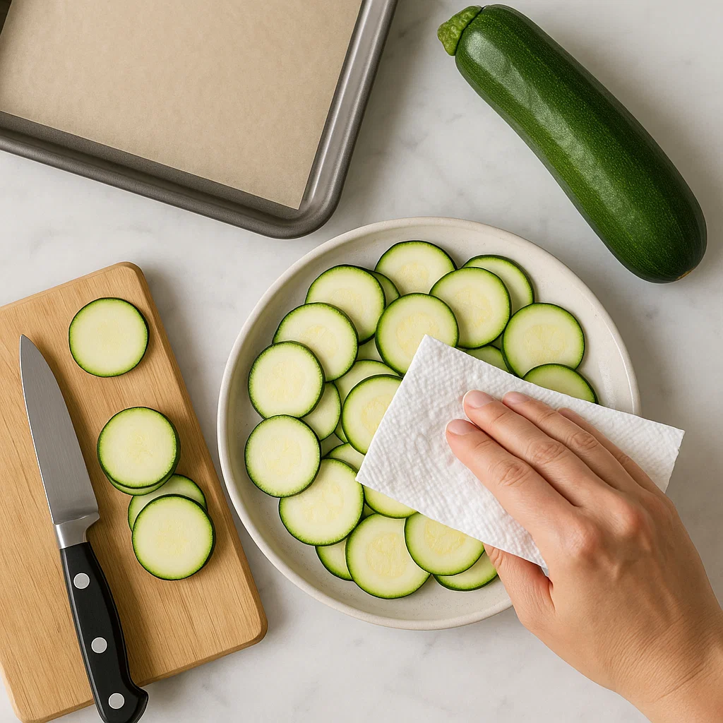 - Pat the zucchini slices dry with a paper towel to remove excess moisture. This will help them crisp up in the oven.
