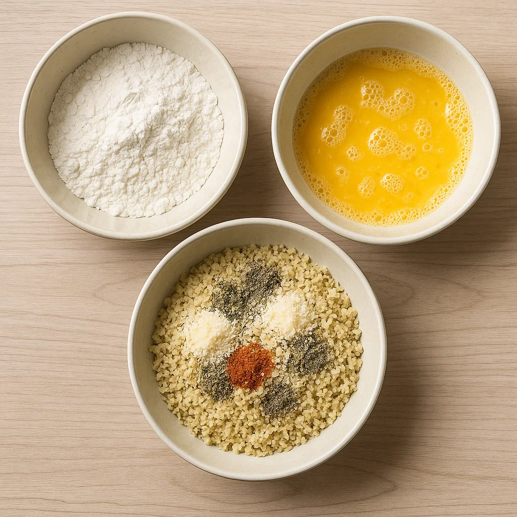 - In a third shallow bowl, combine the panko breadcrumbs, Parmesan cheese, garlic powder, onion powder, paprika, salt, and pepper.