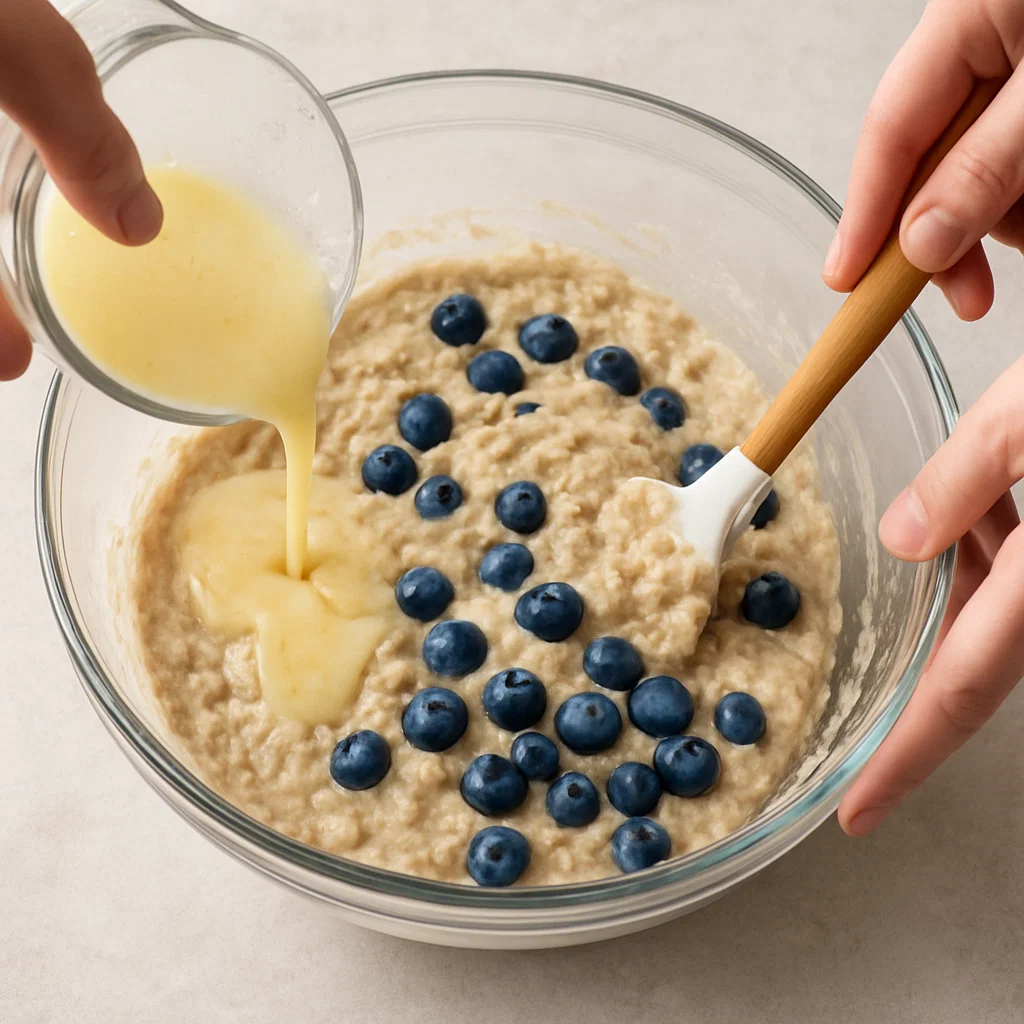 Once the batter is combined, gently fold in the fresh blueberries. The berries will add a burst of sweetness to each bite.
