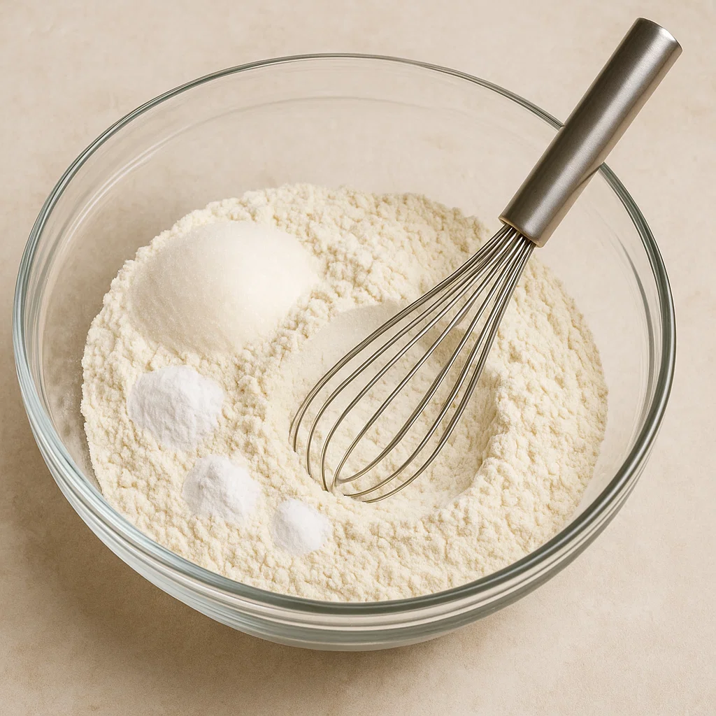 In a separate large bowl, combine the flour, sugar, baking powder, baking soda, and salt. These dry ingredients are the foundation of your fluffy pancakes. Make sure to sift them or whisk them together to ensure an even texture.