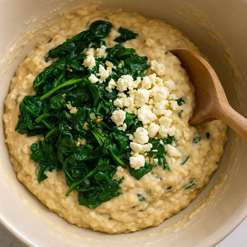 Then, fold in the sautéed spinach, garlic, and crumbled feta cheese. The feta will add a rich, tangy flavor that perfectly complements the savory spinach.