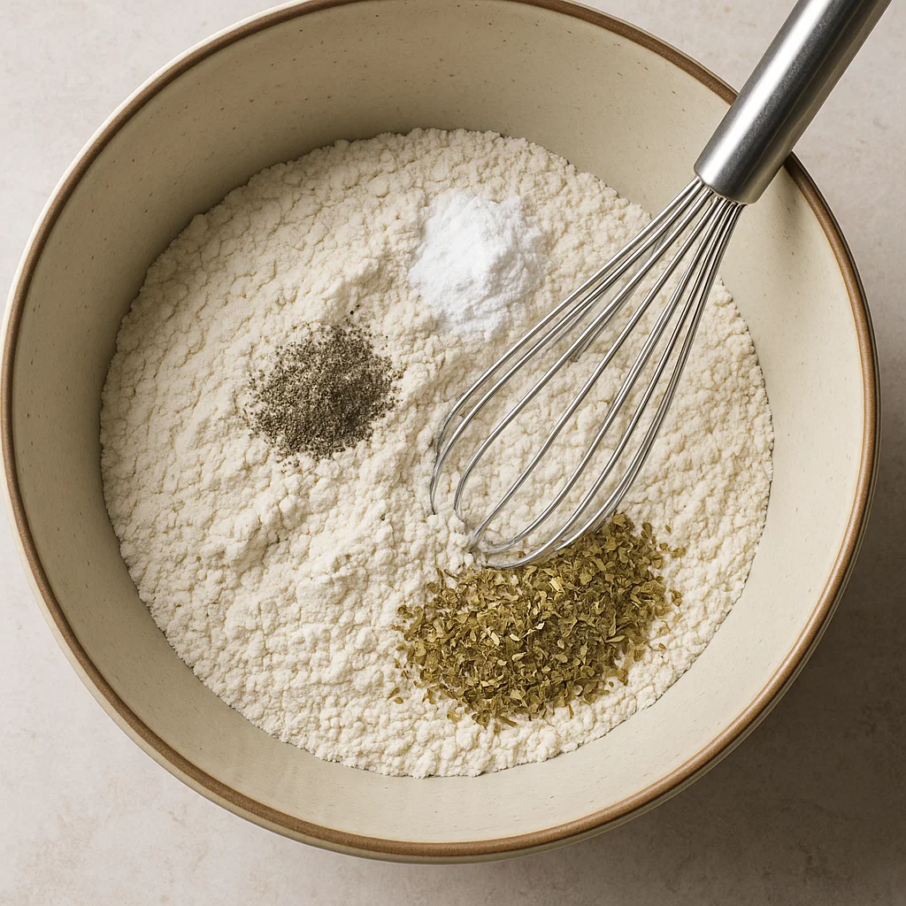 In a large mixing bowl, whisk together the flour, baking powder, salt, black pepper, and dried oregano. Make sure the baking powder is evenly distributed throughout the dry ingredients so your muffins rise evenly.