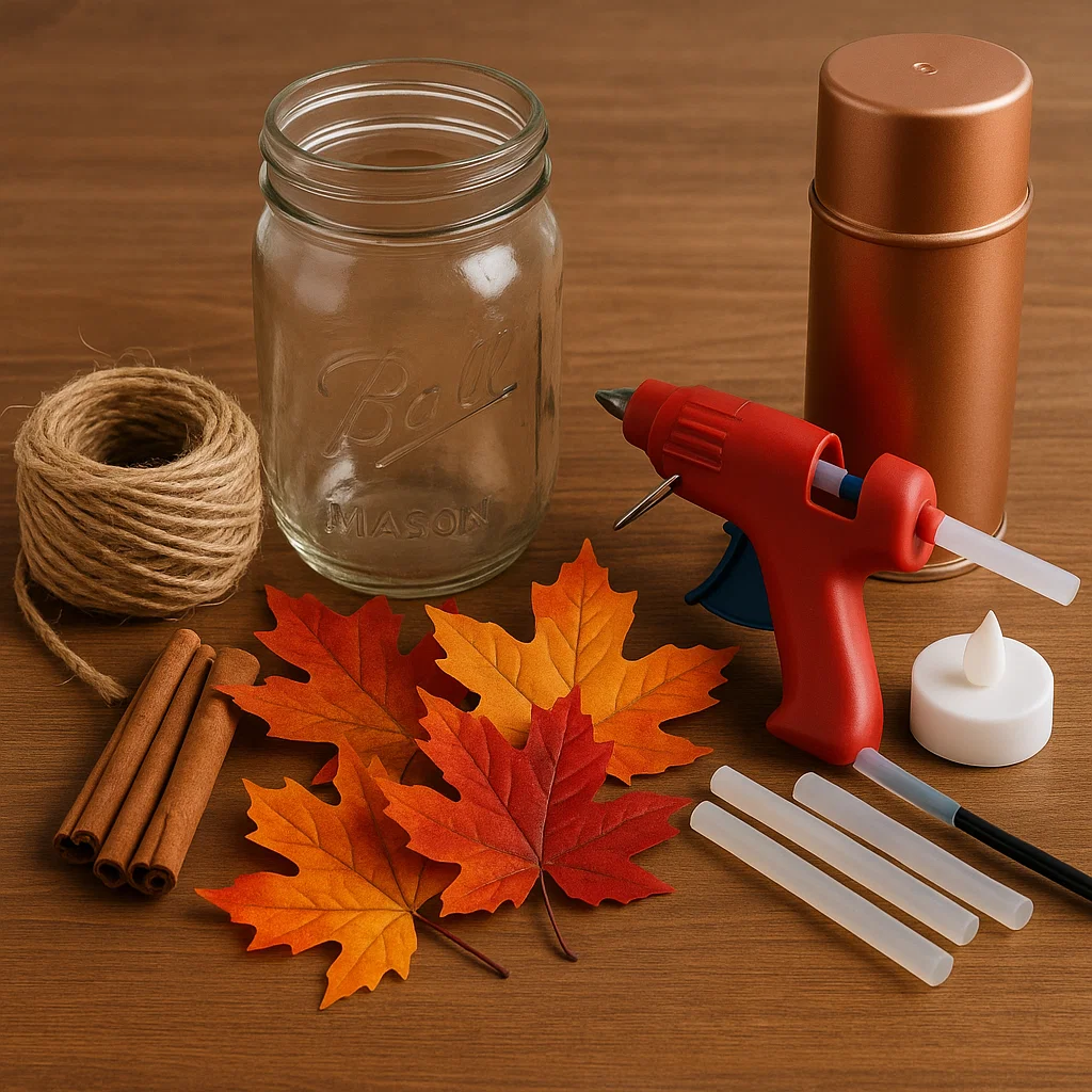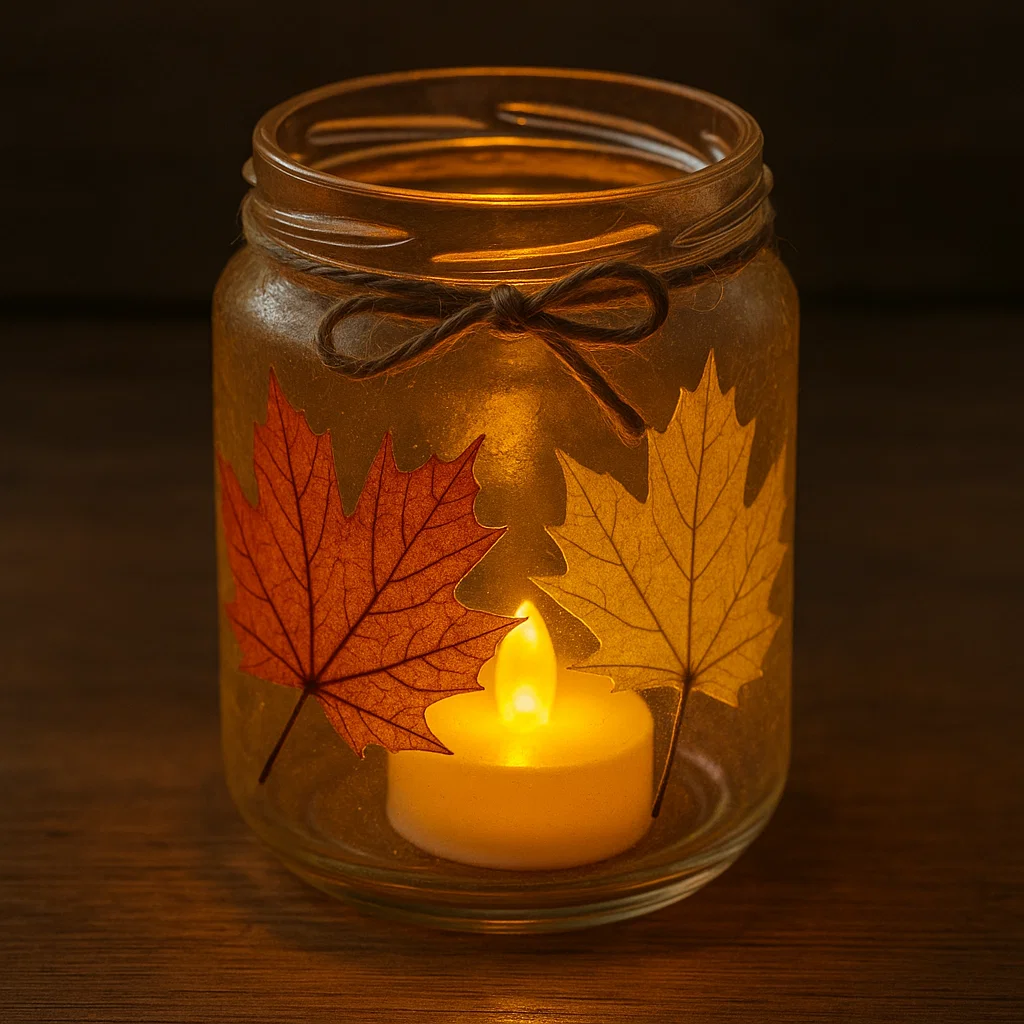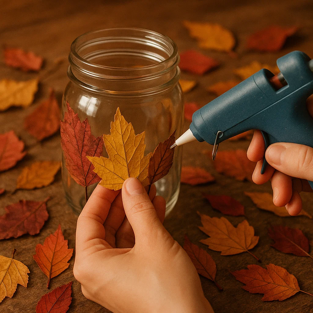 Next, grab your autumn leaves. If you’re using real leaves, press them between paper towels or in a heavy book to dry them out first. Arrange the leaves around the outside of the jar, securing them with hot glue. This will create a natural, earthy vibe perfect for fall.