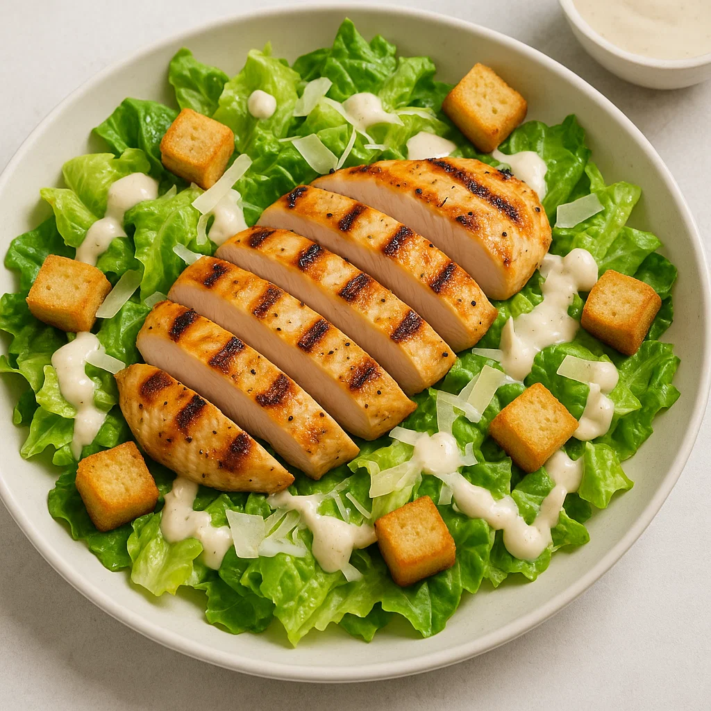 - Slice the chicken and serve on top of the lettuce with croutons, Parmesan cheese, and Caesar dressing.