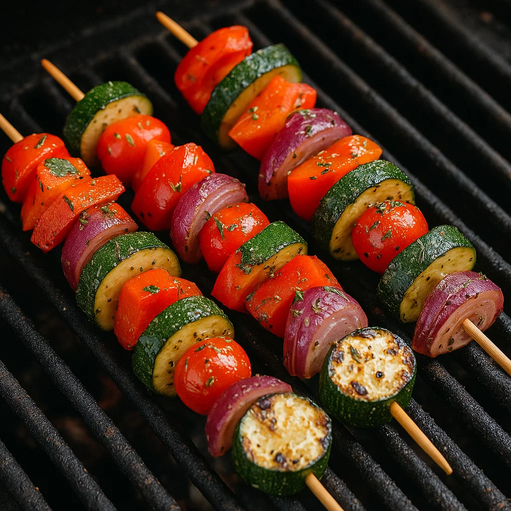- Grill the skewers for 5-7 minutes per side until the veggies are charred and tender.