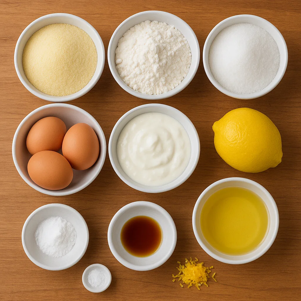 In a large bowl, whisk eggs and sugar until fluffy, about 3-4 minutes. Add yogurt, vegetable oil, vanilla, and lemon zest, mixing until smooth. Slowly fold in semolina, flour, and baking powder until the batter is uniform.