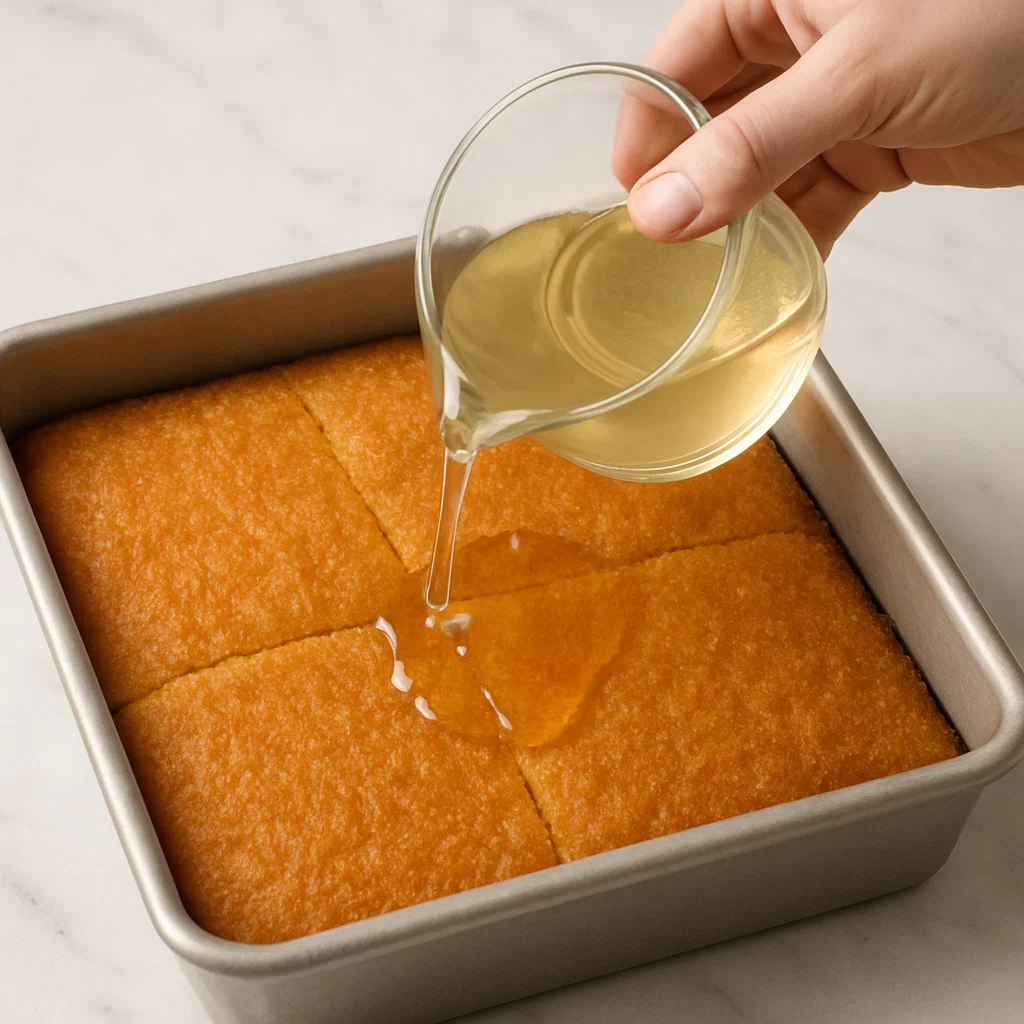 Once the cake is out of the oven, let it rest for 5 minutes. Then pour the cooled syrup evenly over the warm cake. The semolina will absorb the syrup slowly, creating a moist, fragrant texture.
