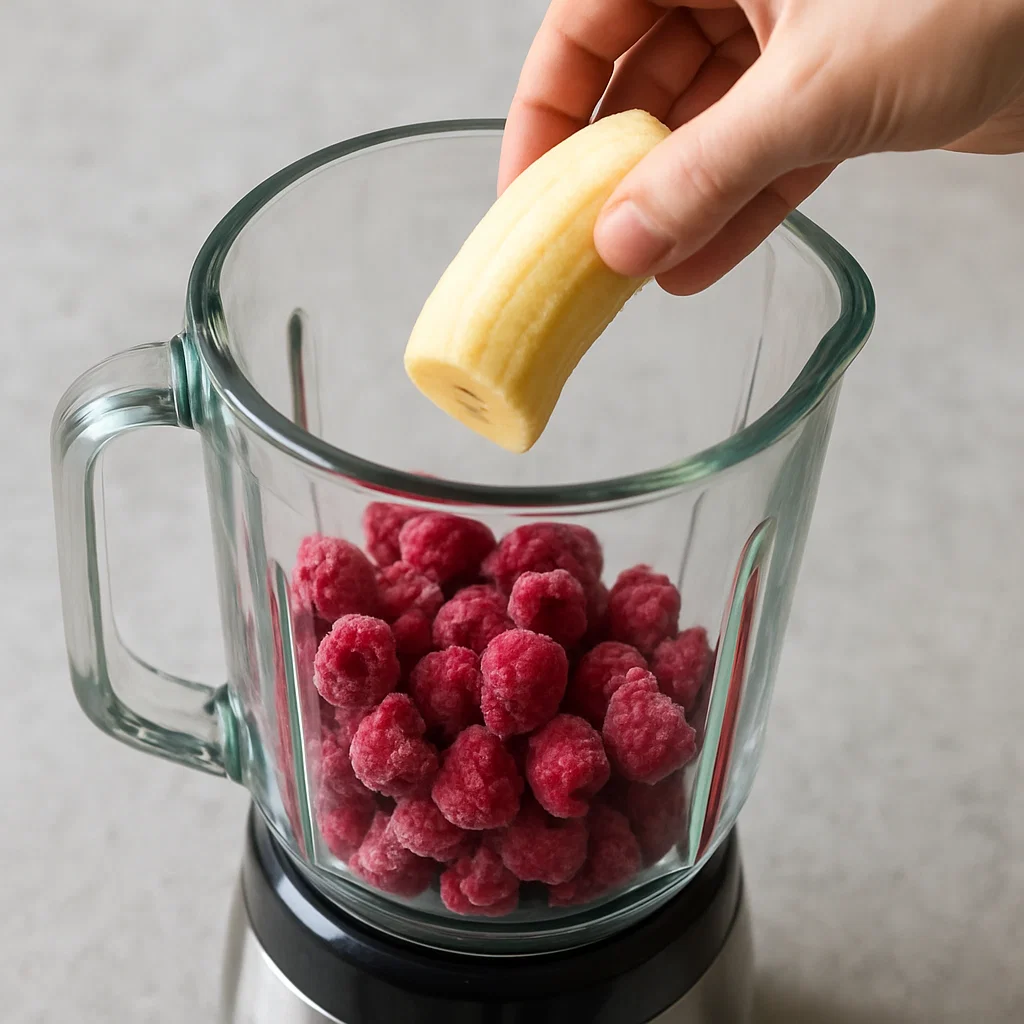 Start by adding your frozen raspberries and half of a ripe banana into your blender. The frozen raspberries give the smoothie that thick, slushy texture that makes it so satisfying. The banana will create a creamy base, making it feel more like a treat than a health drink!