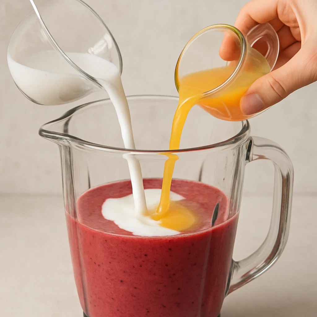 Next, pour in your coconut milk and a splash of orange juice. The coconut milk brings in that dreamy texture, and the orange juice gives the smoothie that fresh citrus zing. The combo makes it feel like you’re sipping a tropical vacation in a glass!