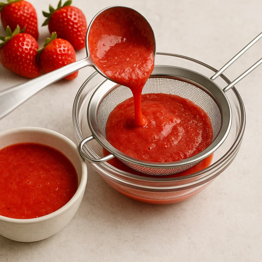 Begin by blending fresh strawberries into a smooth puree. Strain the mixture through a fine mesh sieve to remove seeds, ensuring a silky consistency.