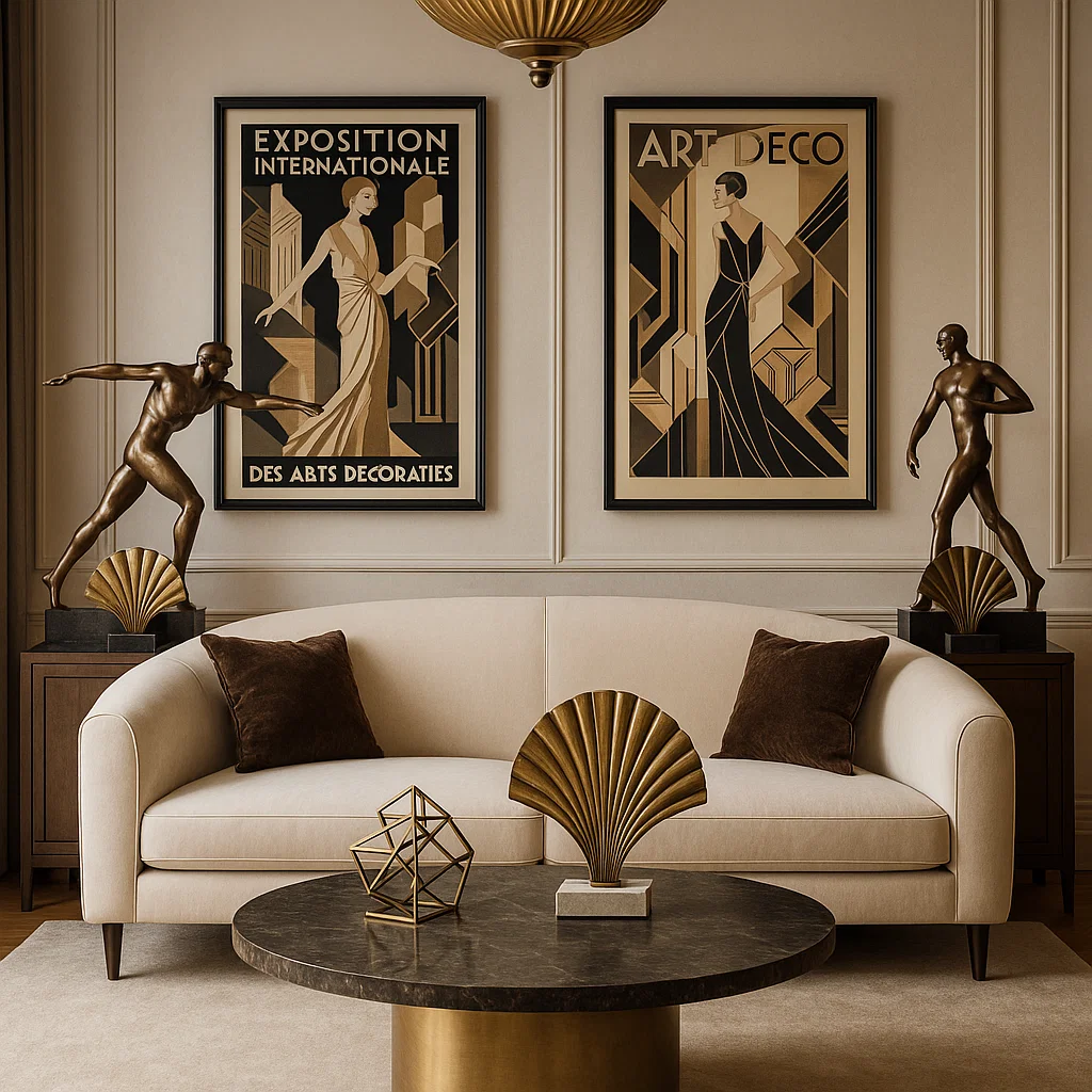 To take the Art Deco glam style even further, consider incorporating some geometric metal sculptures, Art Deco-style posters, or small fan-shaped decorative objects. These pieces nod to the artistry and craftsmanship of the era and add that final touch of sophistication. Whether it’s a statement metal statue or a vintage poster with bold lines and shapes, these accents enrich the space with additional layers of texture and style.