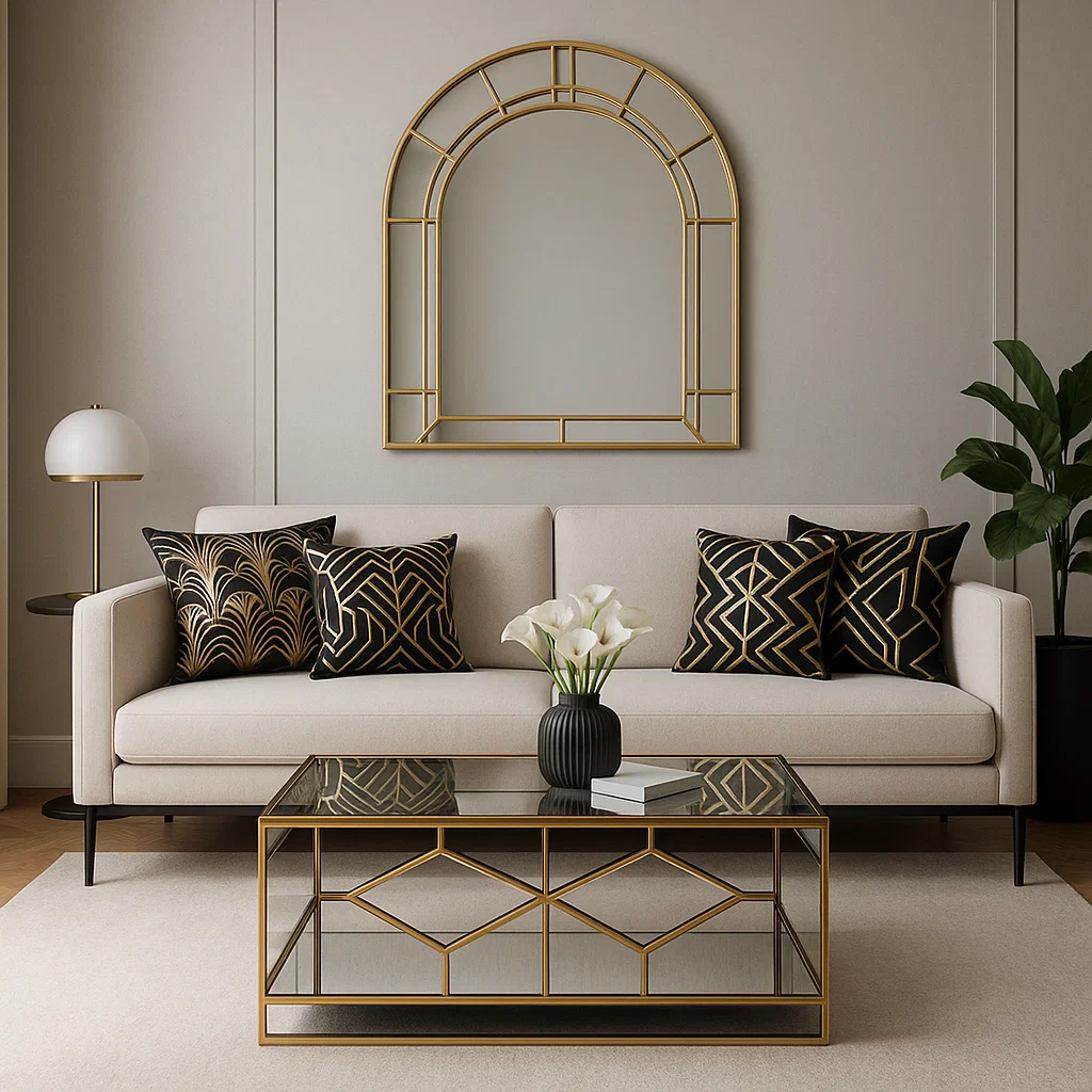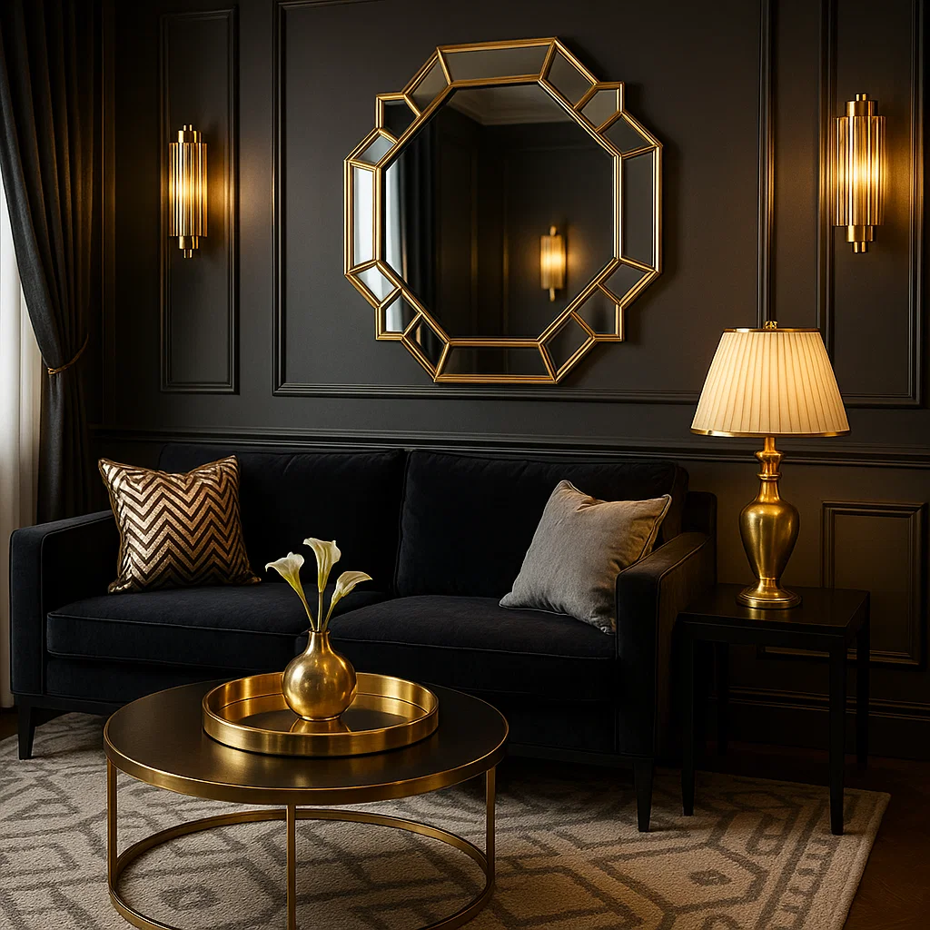 Nothing says Art Deco glam like metallic accents. Think gold-framed mirrors, chrome light fixtures, or brass lamp bases. These elements not only reflect light, but they also add a sophisticated, shiny touch to your room. If you prefer subtlety, even a small gold vase or metallic tray can make a big impact.
