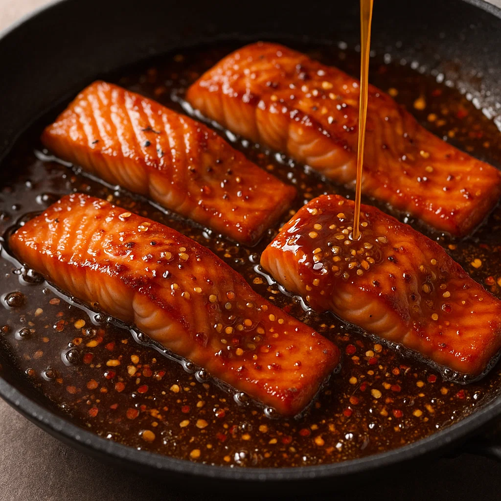 Once your salmon is seared, reduce the heat to medium-low and pour the irresistible honey garlic sauce over the fillets. Let it simmer for about 1-2 minutes to thicken and get that perfect sticky texture. The sauce will coat the salmon, making each bite incredibly flavorful. In just 2-3 minutes, you’ll have the sauce ready and the salmon coated beautifully.